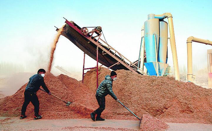 新疆維吾爾自治區喀什地區澤普縣古勒巴格鄉尤庫日喀拉尤勒滾村工作人員將核桃枝等林木廢料用木屑顆粒機生產線進行處理,用于制作生物質顆粒燃料。木屑顆粒機生產線不僅將核桃枝、核桃殼利用了起來,還將紅棗枝、楊樹枝、花生殼等利用了起來。