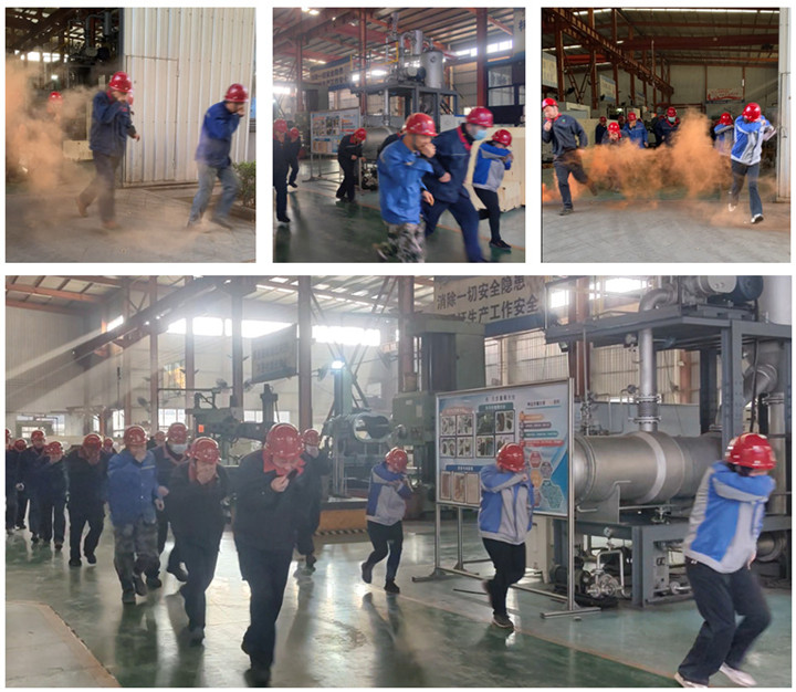滅火器實操培訓結束后,應急逃生演練隨即展開。隨著模擬火災警報聲響起,煙霧燃起,各部門負責人迅速組織員工用濕毛巾捂住口鼻,彎腰低姿沿著預定疏散路線快速移動。疏散過程中,大家嚴格遵守 “不擁擠、不推搡、不慌亂” 的原則,在安全員的引導下有序通過 “煙霧區” 和疏散通道,最終在指定安全區域集合。